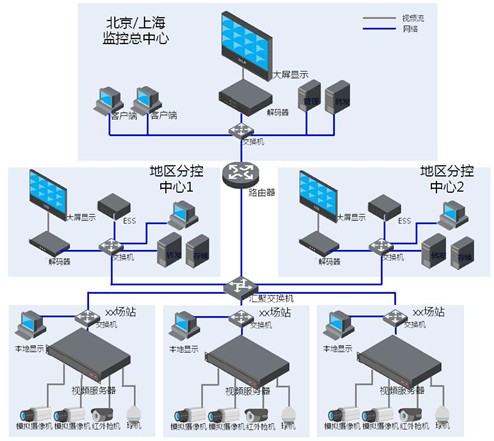 本系統(tǒng)由一級總控中心、二級地區(qū)分控中心、站場閥室基層系統(tǒng)三級結(jié)構(gòu)。三級視頻監(jiān)控的視頻監(jiān)控系統(tǒng)經(jīng)該二級地區(qū)分控中心上聯(lián)一級總控中心。