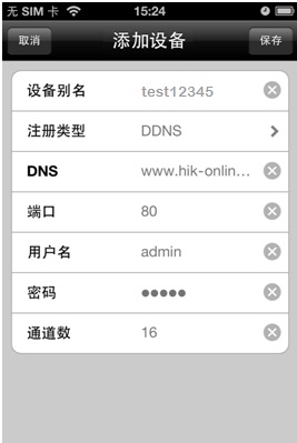 打開iVMS-4500手機(jī)客戶端,進(jìn)入“設(shè)備管理”界面添加設(shè)備。設(shè)備別名處輸入注冊(cè)的設(shè)備域名(例如test12345),注冊(cè)類型選擇DDNS,DNS地址默認(rèn)為www.hik-online.com,端口為80(固定填寫),輸入設(shè)備用戶名密碼,保存之后即可進(jìn)入預(yù)覽界面預(yù)覽。