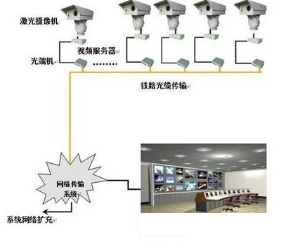 時下,這些設備已在鐵路安防監(jiān)控系統(tǒng)中發(fā)揮實質性的作用,相關方案已用于太原鐵路局(1000余套)、武漢鐵路局宜萬線、廣深鐵路沿線、廣坪鐵路沿線等線路,徹底克服了夜間監(jiān)控效果差等諸多問題,實現(xiàn)了24小時全天候視頻安全監(jiān)控。總體實施方案系統(tǒng)結構示意圖如下圖4所示。