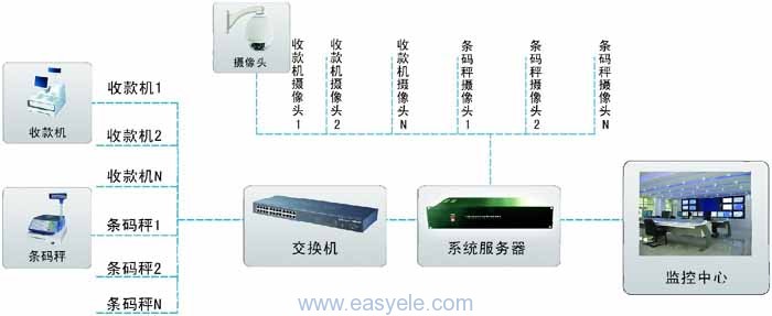 本系統(tǒng)要實(shí)現(xiàn)的主要功能有:現(xiàn)前臺(tái)員工每次掃描商品,都會(huì)在監(jiān)控畫面上同步顯示出商品名稱、單價(jià)、數(shù)量、金額、款臺(tái)號(hào)、員工號(hào)等信息,通過后臺(tái)系統(tǒng)管理軟件實(shí)現(xiàn)商品信息集中管理,并可單獨(dú)回放指定員工、商品的錄像片段。