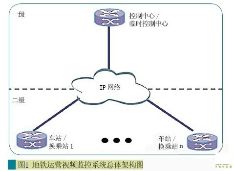 其中運(yùn)營視頻監(jiān)控系統(tǒng)為二級架構(gòu),在車站/換乘站設(shè)立二級監(jiān)控中心,負(fù)責(zé)監(jiān)控本站相關(guān)情況,在控制/備用中心設(shè)立一級監(jiān)控中心,負(fù)責(zé)整個線路的遠(yuǎn)程監(jiān)控,架構(gòu)示意如圖1所示。