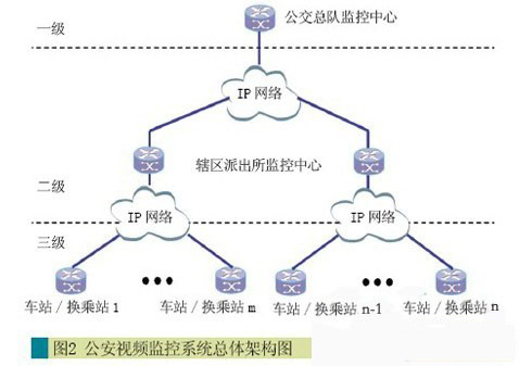 公安視頻監(jiān)控系統(tǒng)為三級架構(gòu),在車站/換乘站公安值班室設(shè)立三級監(jiān)控中心,負(fù)責(zé)監(jiān)控本站相關(guān)情況,在派出所設(shè)立二級監(jiān)控中心,負(fù)責(zé)監(jiān)控轄區(qū)所在車站/換乘站相關(guān)情況,在公交總隊設(shè)立一級監(jiān)控中心,負(fù)責(zé)整個線路的遠(yuǎn)程監(jiān)控,架構(gòu)示意如圖2所示。