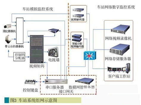 現(xiàn)階段地鐵交通視頻監(jiān)控系統(tǒng)中,會牽涉大量的模擬視頻設(shè)備和數(shù)字視訊設(shè)備,典型的模擬設(shè)備有矩陣、字符迭加器、模擬攝像機(jī)、云臺、多畫面分割器等,典型數(shù)字設(shè)備有網(wǎng)絡(luò)視頻錄像機(jī)、存儲服務(wù)器、安防平臺服務(wù)器、安防管理服務(wù)器、接口網(wǎng)關(guān)、磁盤陣列、編碼器、譯碼器、數(shù)字回放終端等。該方案能夠使這些數(shù)字和模擬設(shè)備融合在一個系統(tǒng)中,使兩者之間能夠互聯(lián)互通、互訪互控。